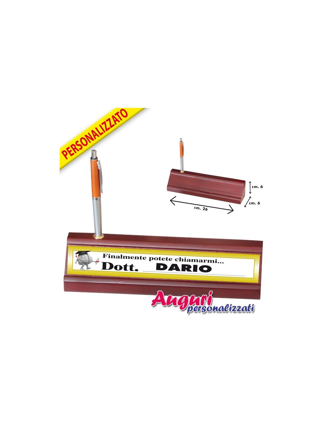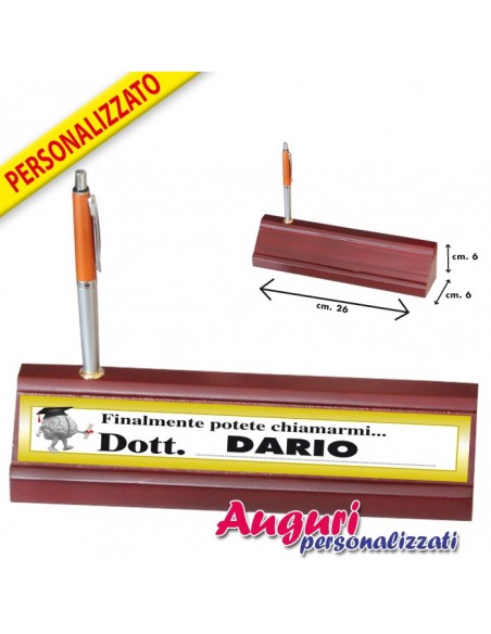 La targa personalizzabile del laureato è in legno ed ha una forma di prisma triangolare. Sulla faccia principale vi è l'etichetta con la scritta "Finalmente potete chiamarmi Dott." dove verrà affiancato il nome del destinatario del regalo. (Scorrendo le foto è possibile vedere un esempio di personalizzazione) Il porta nome è inoltre corredato di penna. Non è da sottovalutare il fatto di regalare un oggetto personalizzato: sottolinea infatti che non si è comprato la prima cosa trovata.