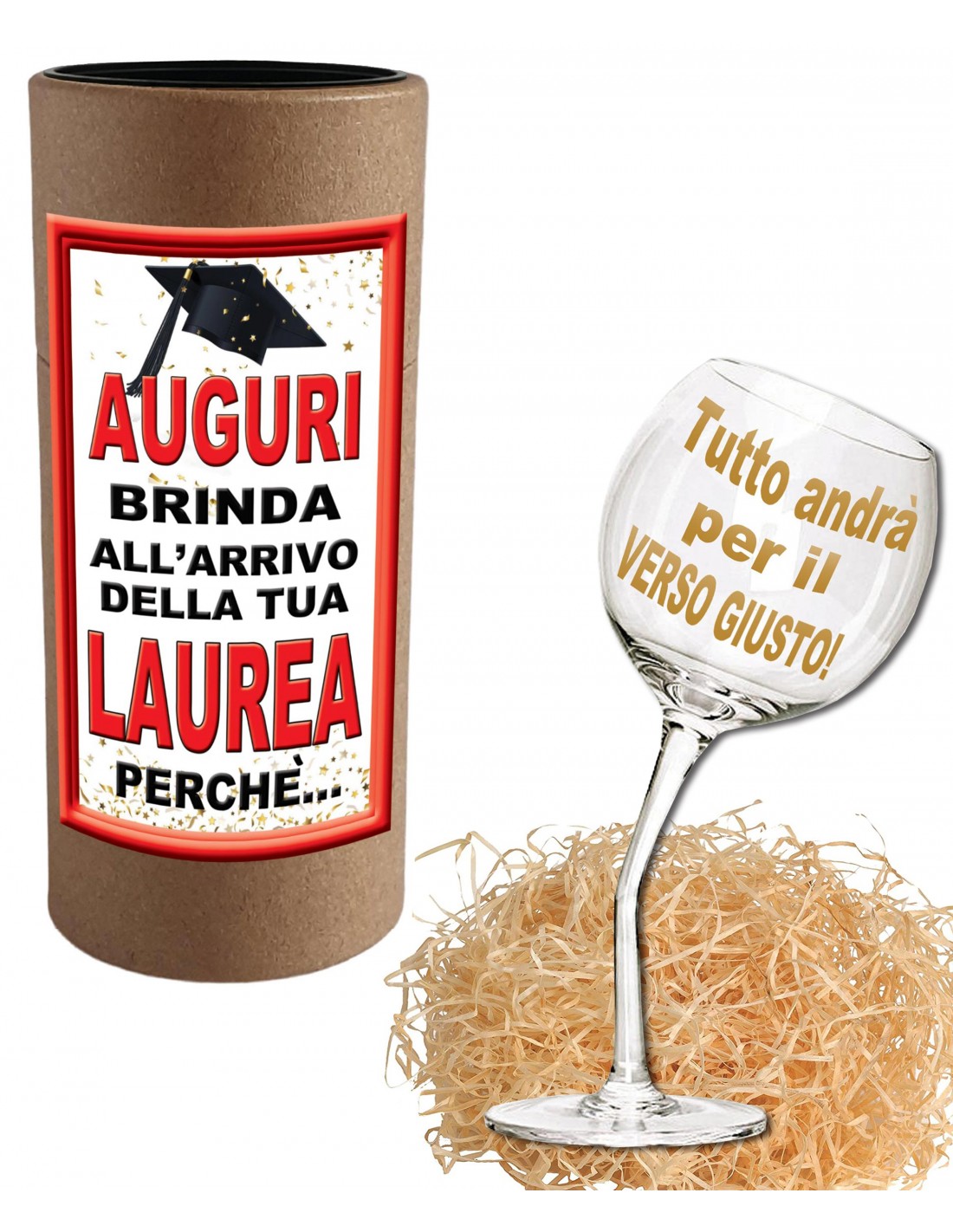 CONFEZIONE REGALO: Un bicchiere da vino a pancia grande dal design senza tempo ma dallo stelo inclinato, protetto da truciolo di paglia, in una confezione regalo biodegradabile in cartone ricoperto di carta color avana e un’etichetta colorata con frase che celebra l’arrivo della Laurea e augura un futuro post-Laurea sempre migliore.