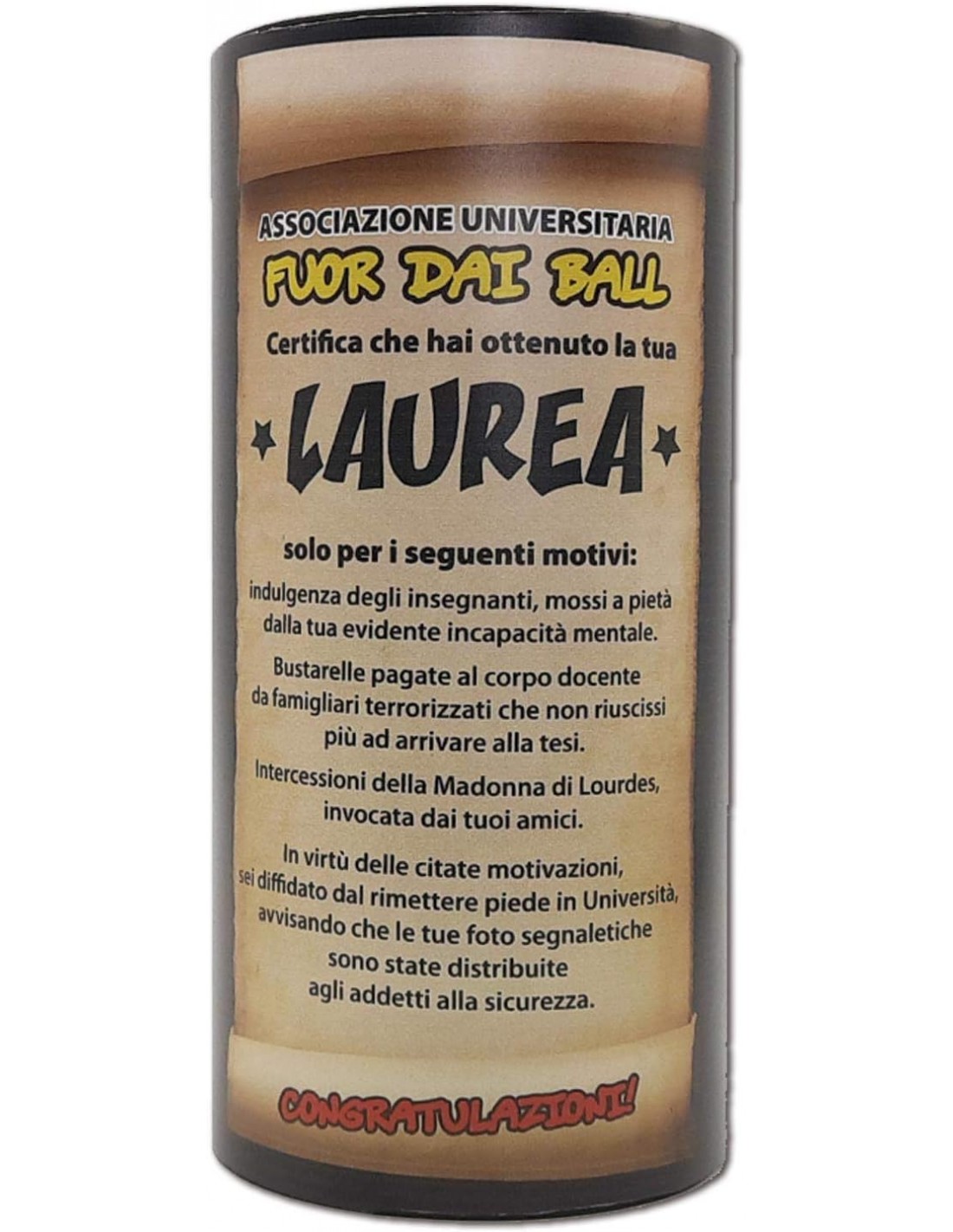 Confezione: Tubo in cartone con divertente adesivo sulle incredibili motivazioni inventate per il conseguimento della Laurea