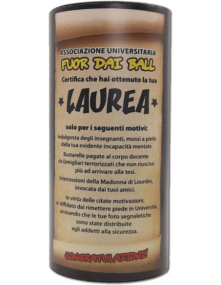Confezione: Tubo in cartone con divertente adesivo sulle incredibili motivazioni inventate per il conseguimento della Laurea