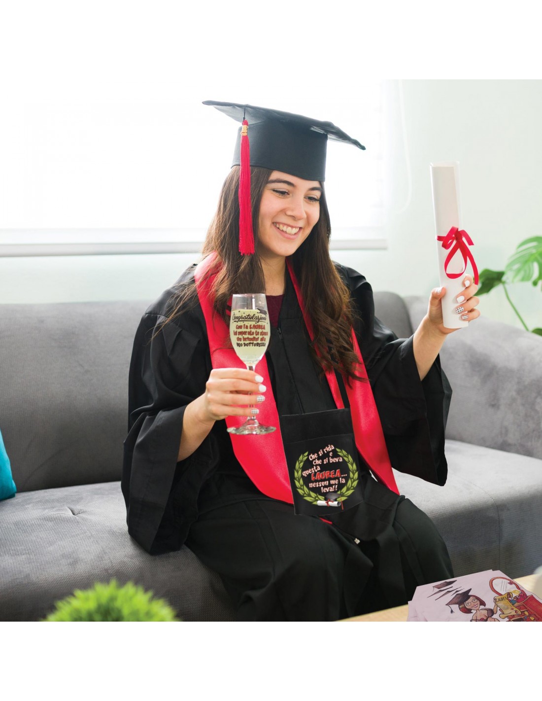 Bicchiere: Calice di 270 ml. in vetro stampato con dedica spiritosa e Congratulazioni per titolo ottenuto, completo di salvagocce