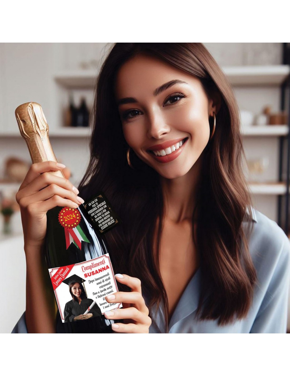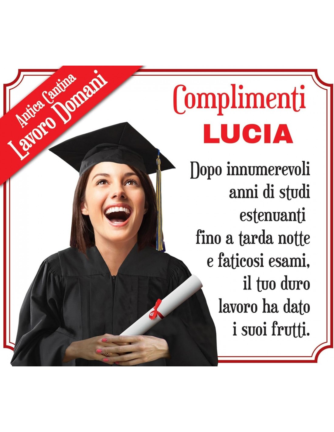 Allora cosa aspetti? Aggiungi all'etichetta, il nome della neo Dottoressa e invia l’immagine del suo volto, magari con un’espressione un po’ buffa, con una e mail a info@auguripersonalizzati.it