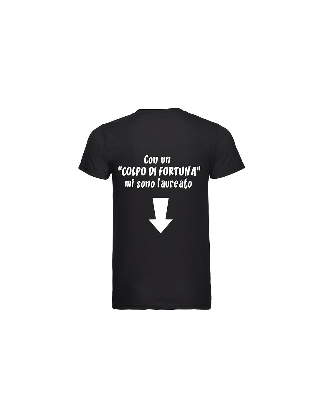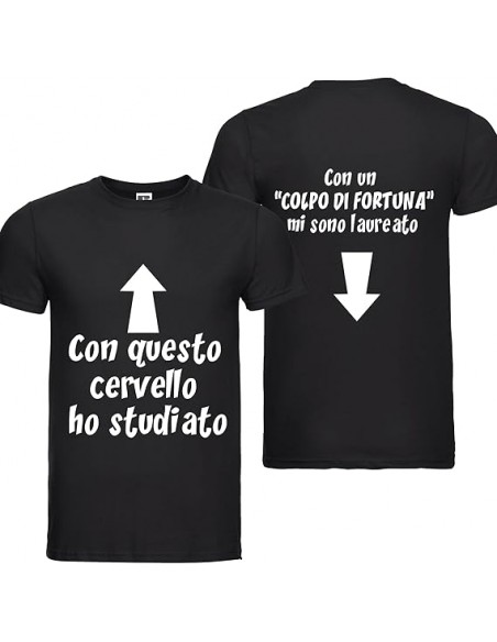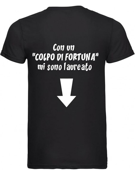 La T-shirt nera stampata davanti e dietro con una sarcastica ed ironica dedica per un neo laureato, da indossare ai festeggiamenti di laurea per confermare che finalmente potra’ fregiarsi del titolo di Dottore, non solo grazie al suo cervello inimitabile e alla sua grande intelligenza ma come stampato sulla t-shirt : anche grazie ad un gran bel Colpo di c…Fortuna