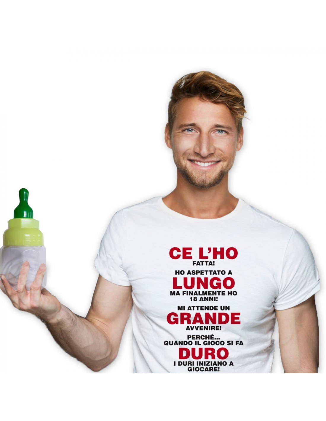 Per l'arrivo della maggiore età del tuo amico, scegli un regalo unico ed esclusivo: donagli un biberon con t-shirt per i 18 anni “grande avvenire”.