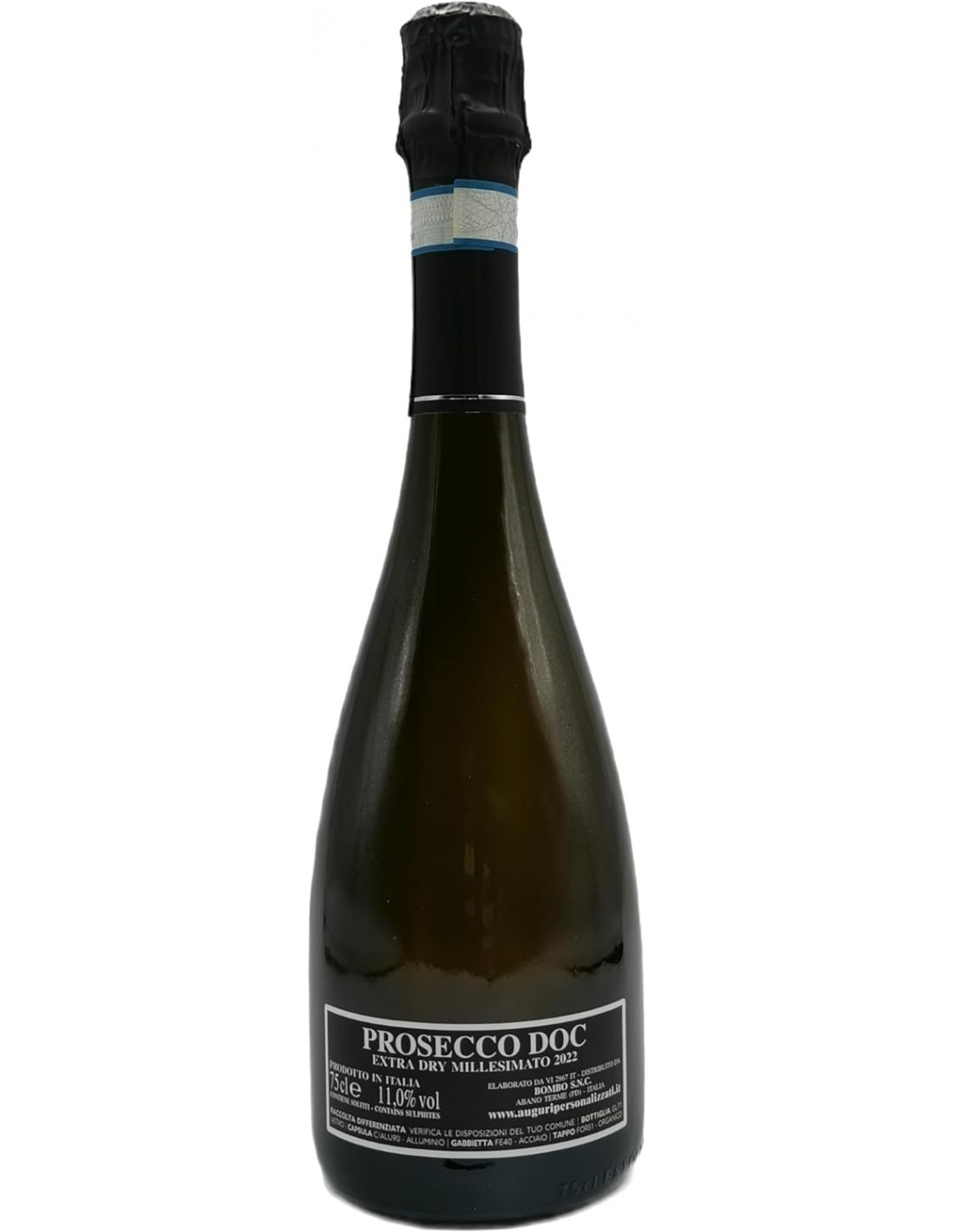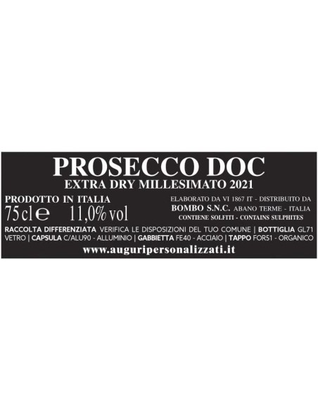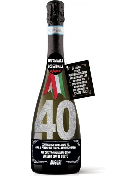 Per riempire questa nostra bottiglia dall’etichetta augurale spiritosa abbiamo scelto il Prosecco Millesimato Extra Dry, perché la sua esuberante effervescenza è simbolo di allegria, è apprezzato da giovani e “stagionati” e servito principalmente durante eventi e festeggiamenti importanti, come il raggiungimento di un traguardo importante come l'arrivo dei 40, perché le cosiddette frizzanti bollicine che contengono anidride carbonica, permettono al tappo di essere praticamente “sparato” dal collo della bottiglia, creando il famoso “botto” PORTAFORTUNA.
