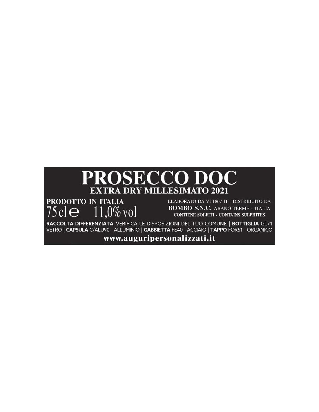 INFORMAZIONI VINO: La bottiglia contiene 750 ml. di Spumante Prosecco DOC Extra Dry- Millesimato di una delle migliori cantine della patria del Prosecco. Se deciderai di stapparla ti consigliamo vivamente di metterla in frigo, oppure nel cestello del ghiaccio senza nessun problema per adesivi ed etichette.