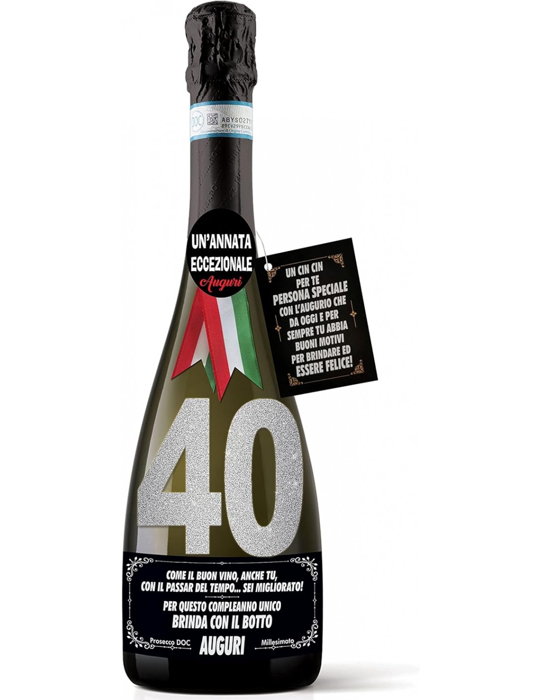 OCCASIONE: Bottiglia di Prosecco con etichette personalizzate con l'età del festeggiato, ideale per il primo cin cin da 40enne