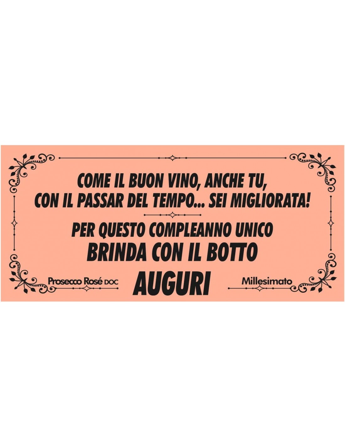 Per riempire questa nostra bottiglia dall’etichetta augurale spiritosa abbiamo scelto il Prosecco Rosè Millesimato Extra Dry, perchè la sua esuberante effervescenza è simbolo di allegria, è apprezzato da giovani e “stagionati” e servito principalmente durante eventi e festeggiamenti importanti, come il raggiungimento di un traguardo importante come l'arrivo della mezza età, perchè le cosiddette frizzanti bollicine che contengono anidride carbonica, permettono al tappo di essere praticamente “sparato” dal collo della bottiglia, creando il famoso “botto” PORTAFORTUNA.