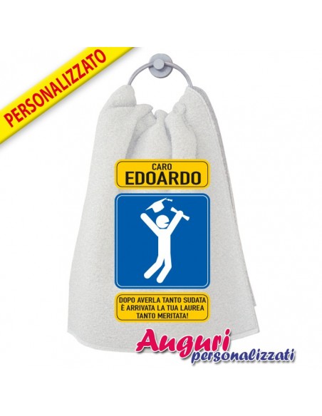 Il tuo amico si laurea e vuoi fargli capire che apprezzi i suoi sforzi per conquistare l'agnognata meta? Scegli l'asciugamano personalizzato con il nome del laureato/a e il messaggio arriverà in modo chiaro.