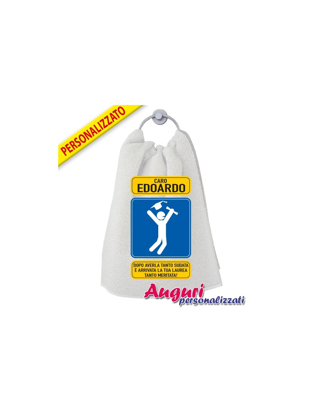 Non dimenticare di salvare la tua personalizzazione per poterla aggiungere al carrelloCome asciugare il sudore di un amico fresco laureato? Semplice con l'asciugamano personalizzato con il nome del laureato/a. Questa simpatica idea regalo può essere personalizzata inserendo nell'apposito spazio il nome del festeggiato. Sotto l'etichetta di colore giallo dove va inserito il nome, vi è un quadrato azzurro con all'interno il disegno di un omino che lancia il copricapo della laurea e ha l'agognato pezzo di carta in mano. Infine, l'ultima etichetta gialla con la scritta: Dopo averla tanto sudata è arrivata la tua laurea tanto meritata.