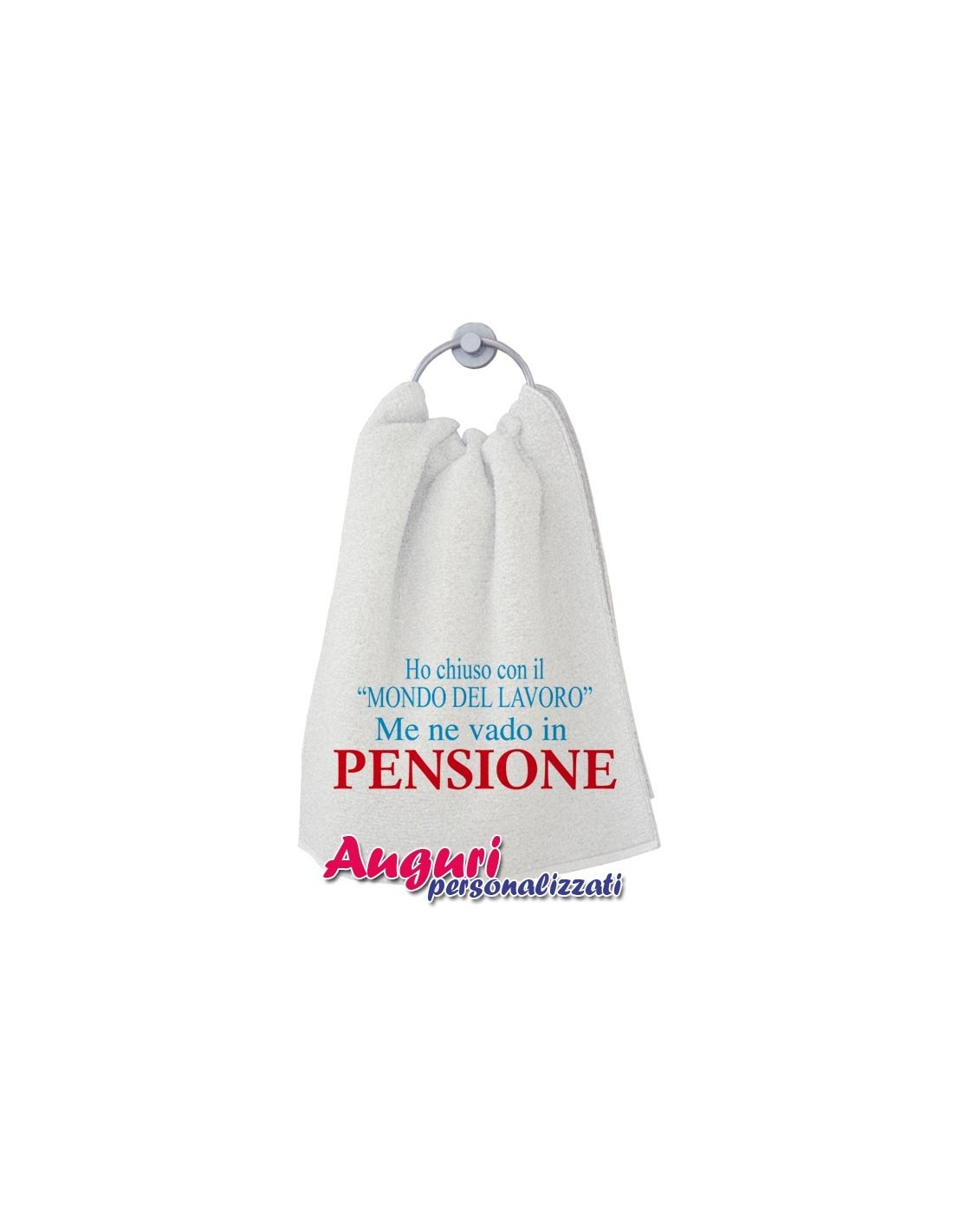 Asciugamano ricamato con frase ironica dedicata alla Pensione, divertente e utile, puo’ essere l'idea regalo giusta e sicuramente originale per il corredo di un/una collega, amico/a o parente, che finalmente raggiunge l'ambito traguardo, lasciando il suo posto nel Mondo del lavoro.