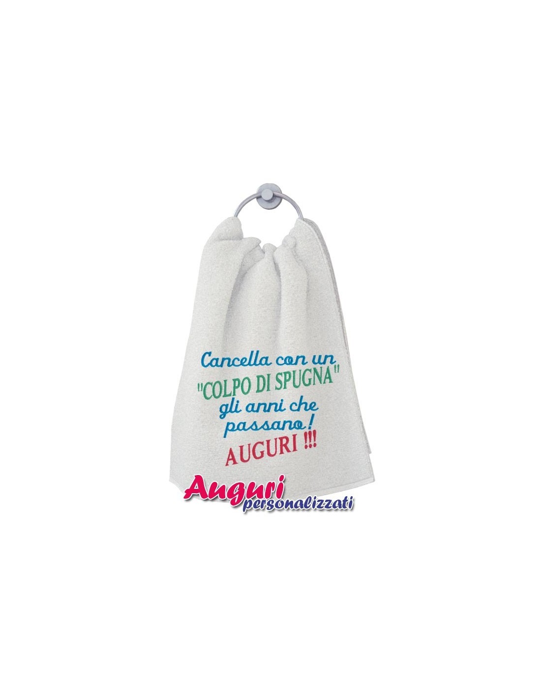 Divertente asciugamano "Cancella gli anni che passano...con un colpo di spugna" in soffice cotone con ricamo che lo rende un omaggio ideale per persone dotate di senso dell'umorismo. Cancellare con un colpo di spugna il passare degli anni è un augurio spiritoso che vuole essere di buon auspicio per chi lo riceve.