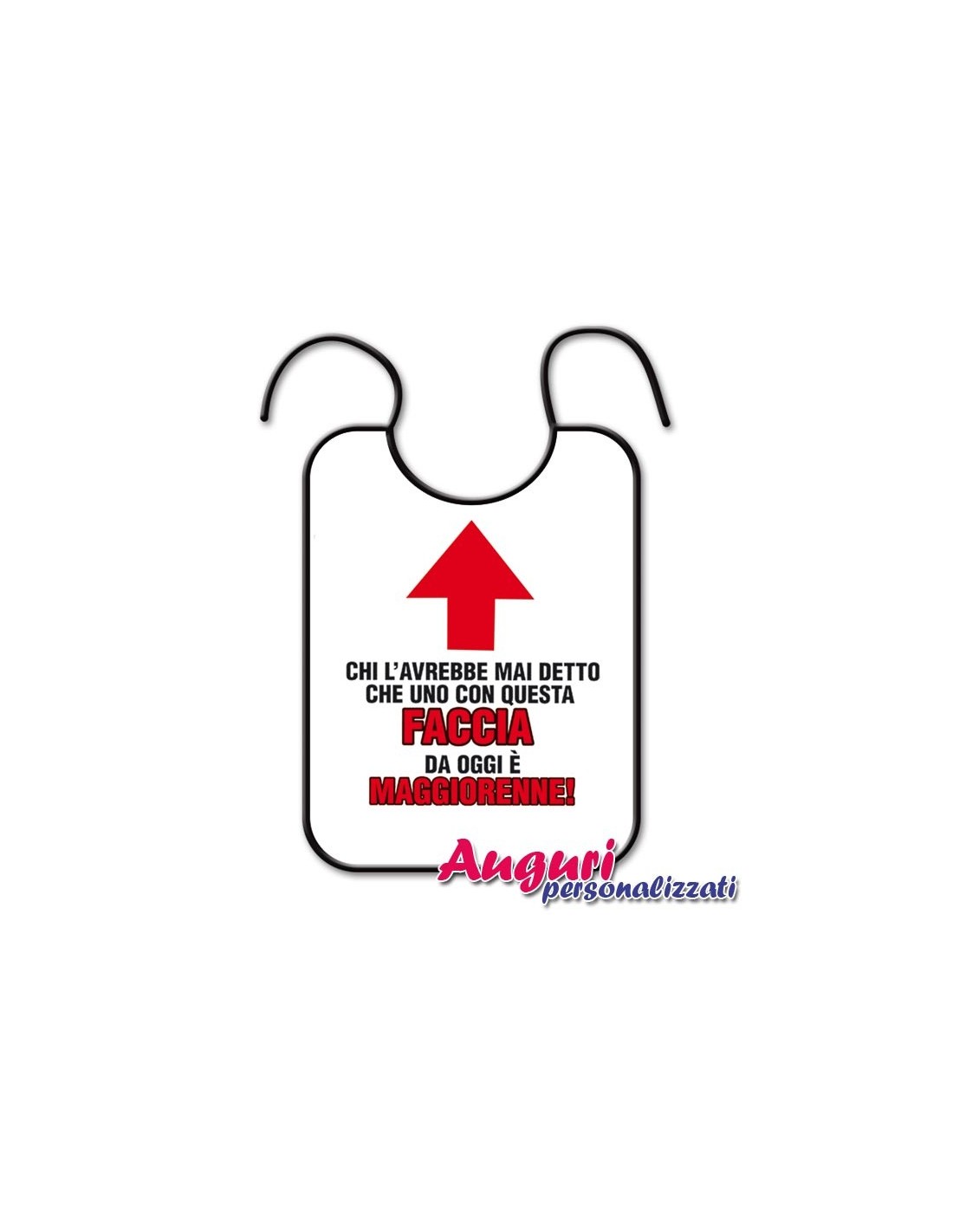 Il simpaticissimo bavaglione per i 18 anni di lui con la scritta “Faccia maggiorenne”, è prodotto in poliestere. La bavetta è alta 60 centimetri e larga 45 centimetri, ideale per essere indossato nel giorno dei festeggiamenti per poi essere conservato come ricordo (magari appeso al muro o su di una mensola). Il gadget reca le simpaticissime battute rivolte al festeggiato, sottostanti a una freccia rivolta verso il volto di chi lo indossa, che faranno esplodere le risate al momento dell'apertura dei regali: chi l'avrebbe mai detto che uno con questa faccia ora è maggiorenne!
