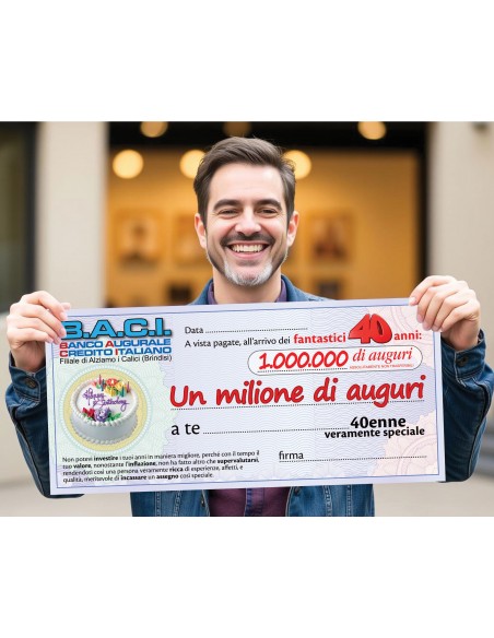 Il maxi assegno per i 40 anni, colpisce al centro l’obiettivo, originale, divertente e colorato, viene incassato immediatamente. Basta presentare il documento d’identità che confermi nome e data di nascita ed subito il cassiere elargisce un milione di auguri, pacche, strette di mano e quant’altro.
