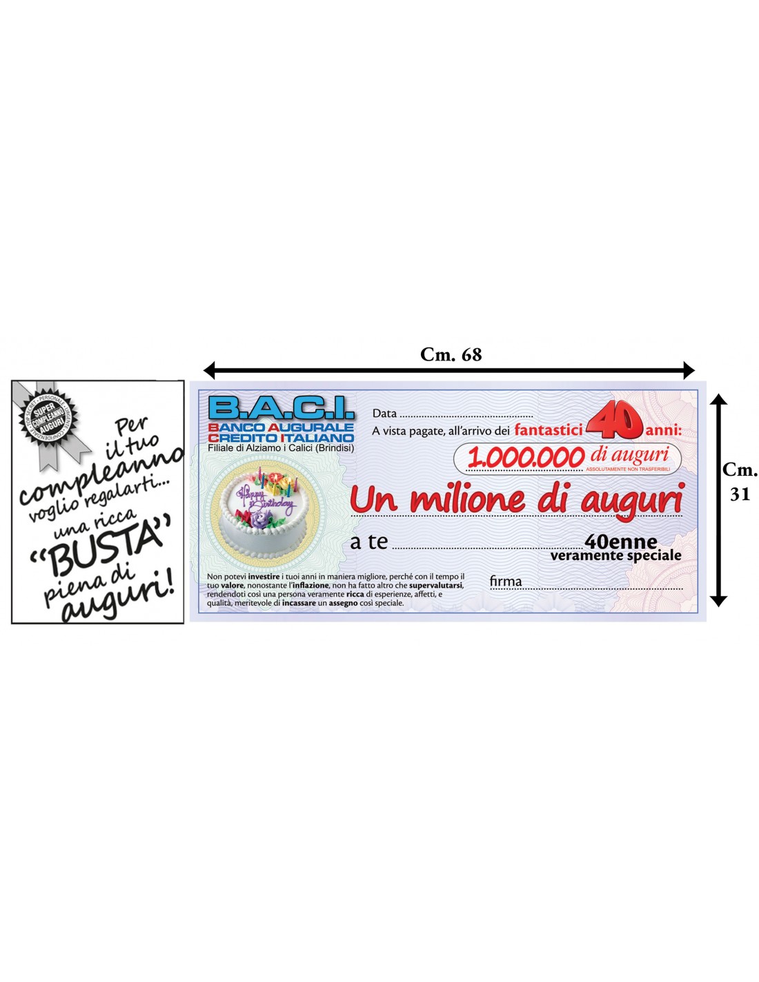 Il biglietto d’auguri è strutturato come un assegno bancario dalle notevoli dimensioni, cm. 68 x 31, corredato di busta gigante prestampata di cm 21 x 32 pronta all’uso che suggerisce il contenuto senza rivelarlo.