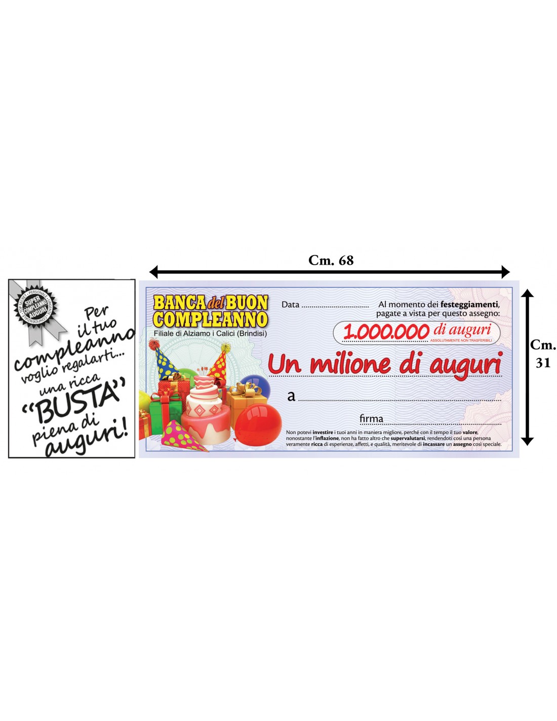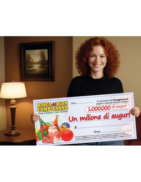 La cifra è scritta a caratteri cubitali su questo assegno che misura cm. 68 x 31 e si trova all'interno di una busta stampata di cm. 21x32. La banca è quella del Buon Compleanno e c'è spazio per apporre tutte le firme dei partecipanti alla festa. Sarà certamente molto apprezzato ed è molto probabile che possa essere messo in cornice per avere un bel ricordo dell'avvenimento.
