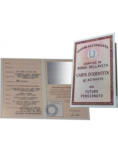 Dimensione cm.15 x 22 e va ad arricchire la già ampia serie di biglietti d'auguri ideati come ottime repliche di una reale carta d'identità. Sin dalla copertina, il gadget è ricco di battute spiritose, che aumentano ancora una volta che il destinatario aprirà il biglietto.