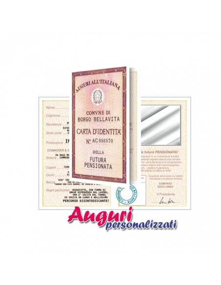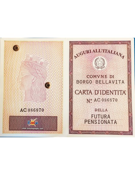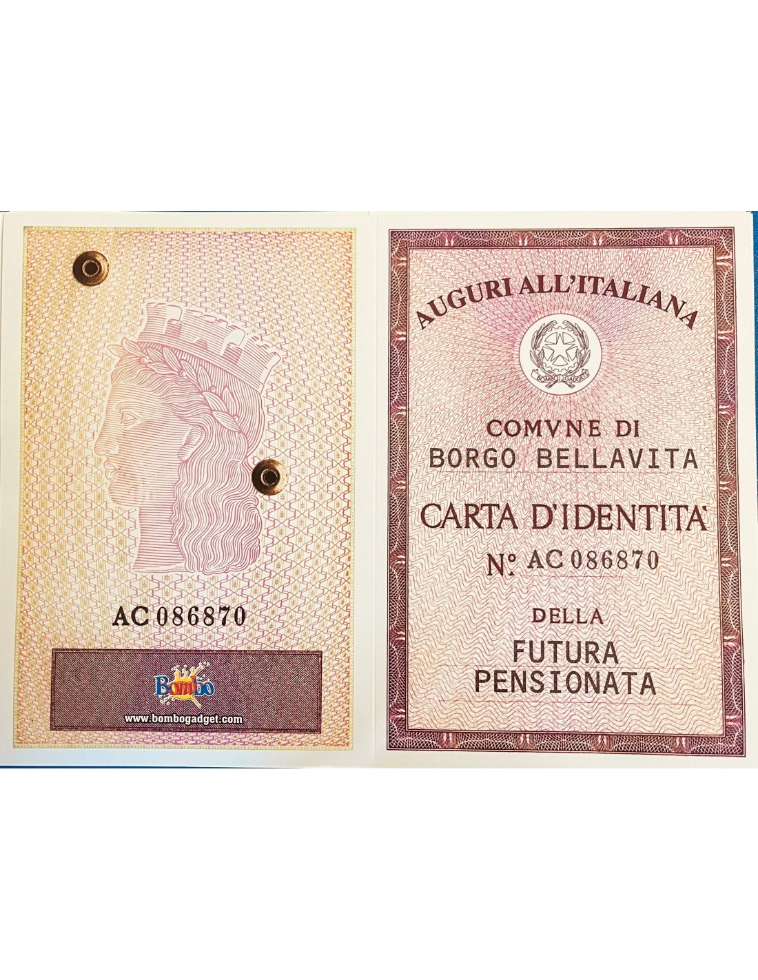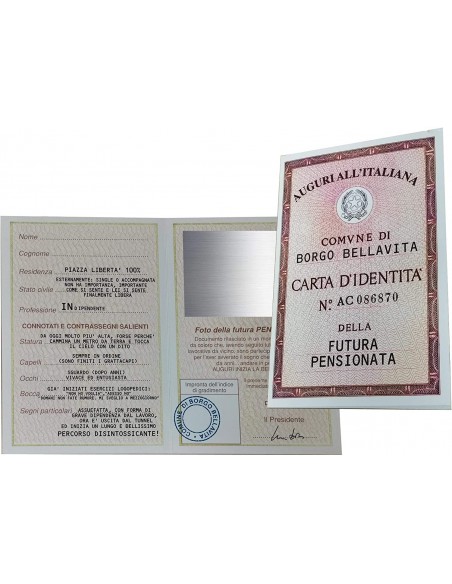 La nostra Carta d'Identita' per la Pensionata è esattamente nell'aspetto come una vera carta d'identità, misura 15 x 22 cm e ha al suo interno e all'esterno stampati tutti gli elementi presenti sul documento originale.