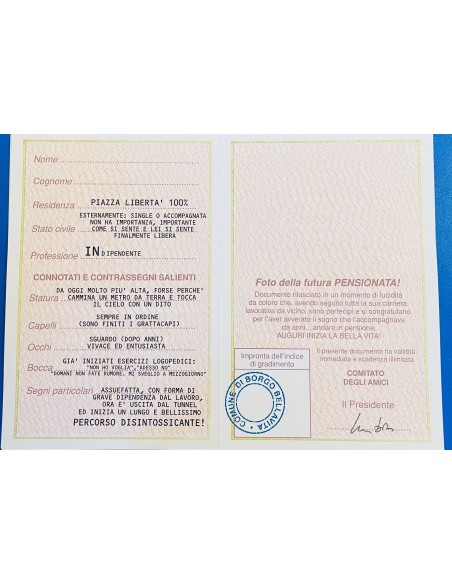 A suggellare il tutto, il timbro comunale del paese di Borgo Bellavita e firma del presidente del comitato degli amici. La futura pensionata potrà iniziare a godersi la vita certificata dal tuo biglietto.