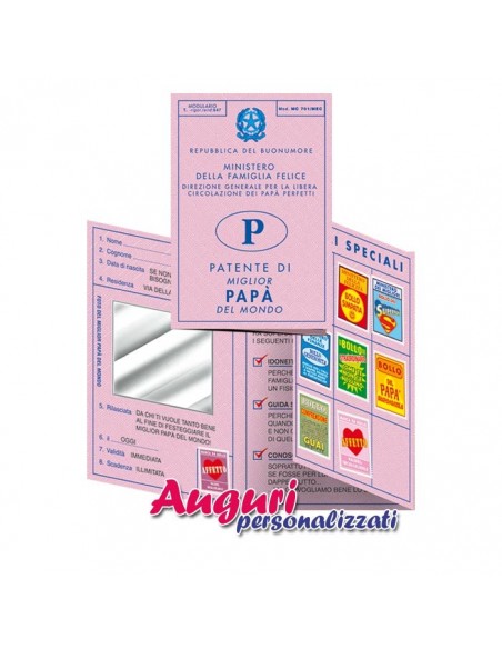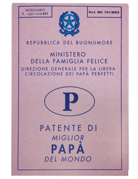 La differenza è nelle scritte che non riguardano la possibilità di guidare veicoli bensì l'ottimo modo con cui viene svolto il ruolo più importante del mondo, cioè quello del padre. Sulla patente sono riportati i bolli con scritte divertenti e la scadenza è illimitata, perché il papà migliore del mondo è per sempre tale. Puoi ulteriormente personalizzarla scrivendo nome e cognome.