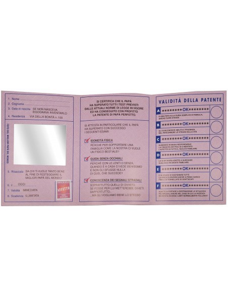 Patente del Papà, un biglietto ripiegato dalle dimensioni di 15 x 22 cm. a forma è esattamente quella di una vecchia patente.