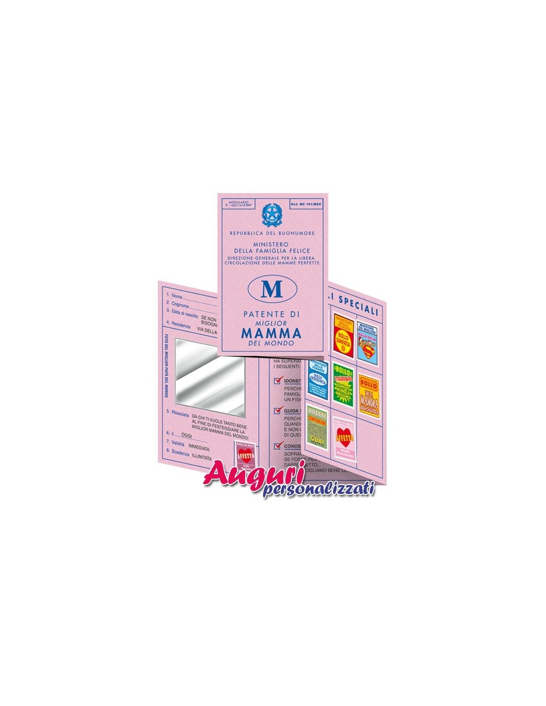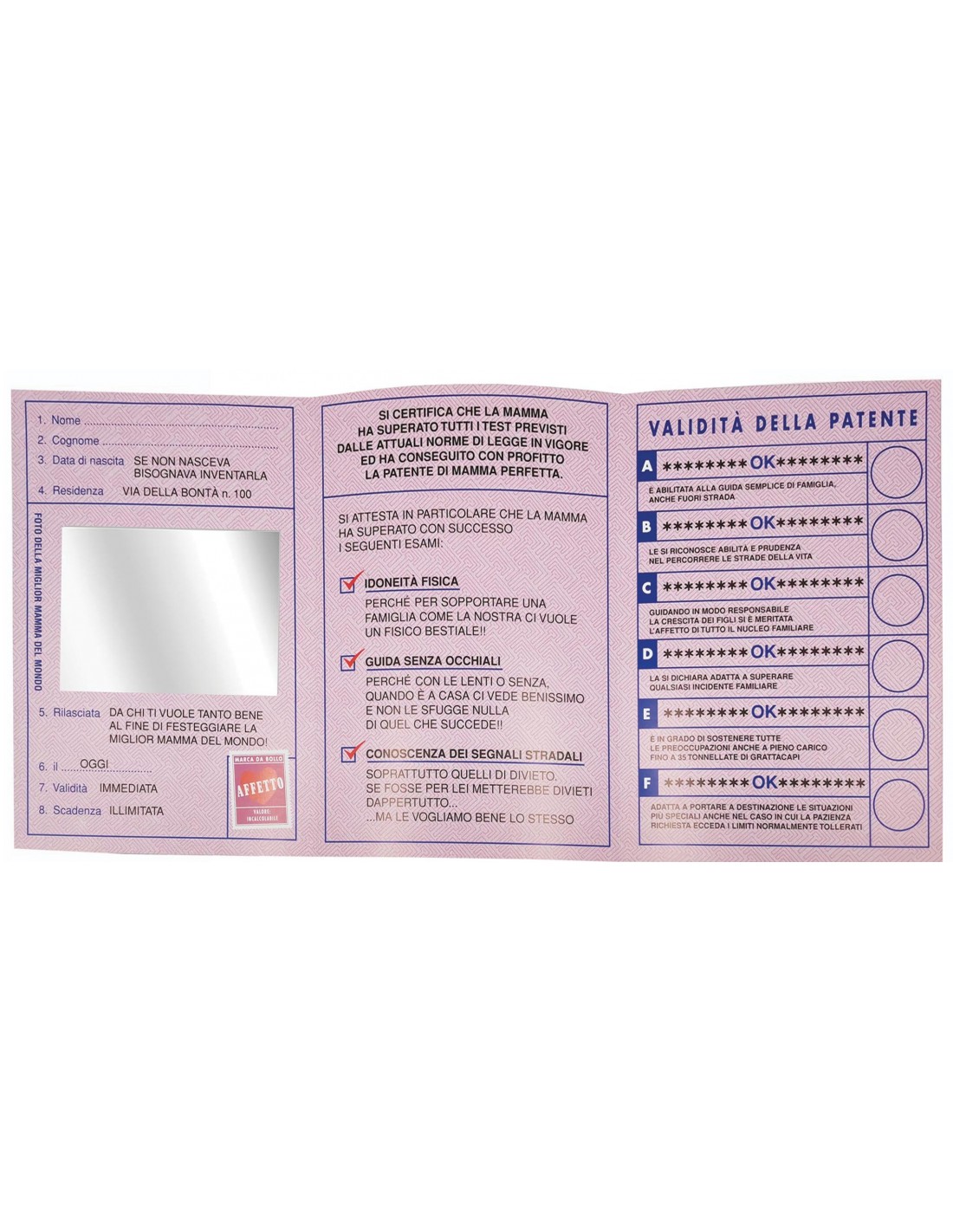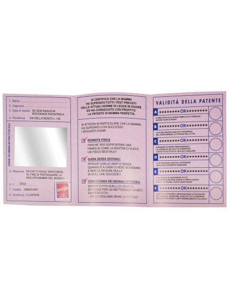 La saggezza popolare è ricca di proverbi sulla Mamma, segno che quella materna era e rimane una figura assolutamente centrale. Festeggia per bene la tua mamma con un regalo accompagnato da questa simpaticissima patente della Mamma. Per un compleanno, un anniversario particolare o anche soltanto per trasformare una normale visita in un'occasione speciale, questo biglietto-patente è l'ideale per farle capire quanto tu le voglia bene e quanto apprezzi i suoi sforzi nell'educarti e crescerti. Puoi litigare, ma il rapporto madre-figlio è indissolubile!