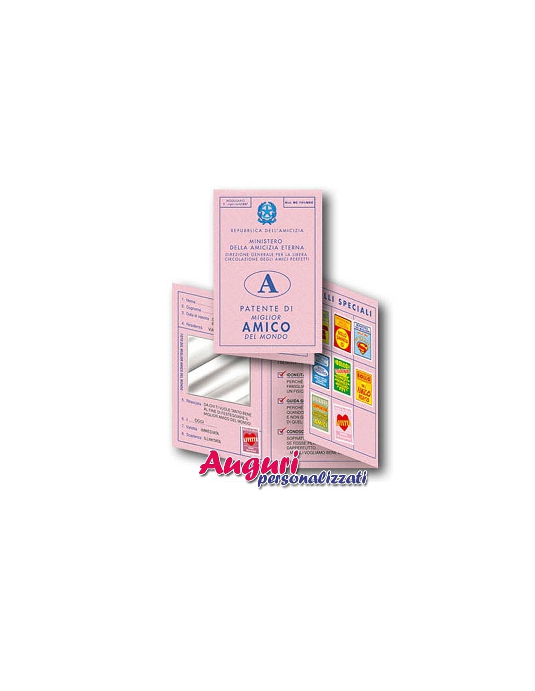 Puoi personalizzare ulteriormente il gadget scrivendo il nome e il cognome della persona a cui lo regali. Il biglietto ha le dimensioni 15 cm. x 22 cm. ed è fatto con una patente per guidare l'automobile. L'originalità è caratterizzata dalle scritte interne che anziché riportare i dati del conducente segnalano la bellezza del rapporto speciale che vi lega. Puoi donare la patente dell'amico come regalo unico oppure mettendola insieme alla confezione di un regalo, per aggiungere un tocco di simpatia in più e per ribadire che tra di voi c'è realmente un sentimento di amicizia importante.