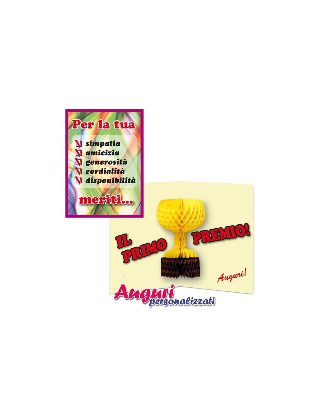 Si tratta di un biglietto cartaceo delle dimensioni di circa 15,5 cm per 21,5 cm di altezza ed è chiaramente dotato di busta, elemento che non può mancare in nessun biglietto d'auguri! Sulla copertina una stampa multicolore a fantasia dove sono elencati i pregi del festeggiato: simpatia, amicizia, generosità, cordialità e disponibilità. All'interno uno sfondo color pastello su cui, al momento in cui aprirà il bigliettino, emergerà il suo trofeo tridimensionale realizzato tramite un festone a nido d'ape