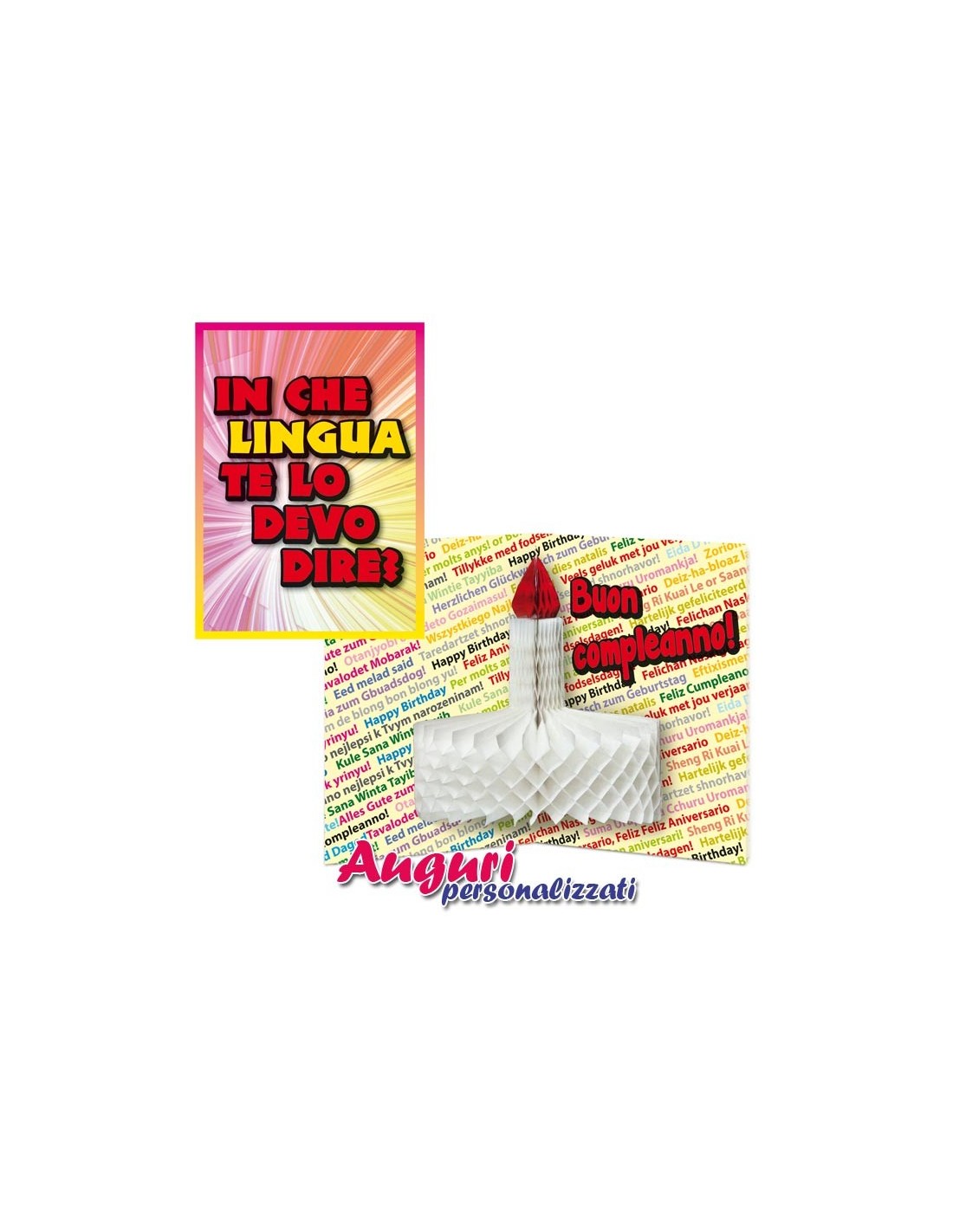 Il coloratissimo biglietto si apre a libro, sulla copertina la scritta: IN CHE LINGUA TE LO DEVO DIRE?. Mentre all'interno, applicato sopra una serie di auguri di Buon Compleanno in tutte le lingue, ecco una torta-festone dal particolare effetto tridimensionale, che realizza un particolare motivo a rombi, con candelina "accesa"