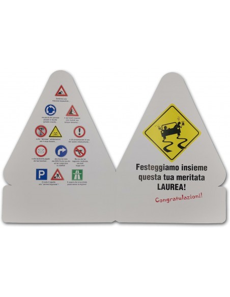 Il segnale “Attenzione: Laurea in arrivo!” avvisa tutti del grande evento, mentre all’interno una simpatica sequenza di segnali stradali rivisitati in chiave umoristica racconta perfettamente il percorso universitario: esami superati (più o meno brillantemente), giornate passate in facoltà, collaborazioni “creative” con i docenti, tesi presentate con entusiasmo… e l’immancabile supporto della famiglia.