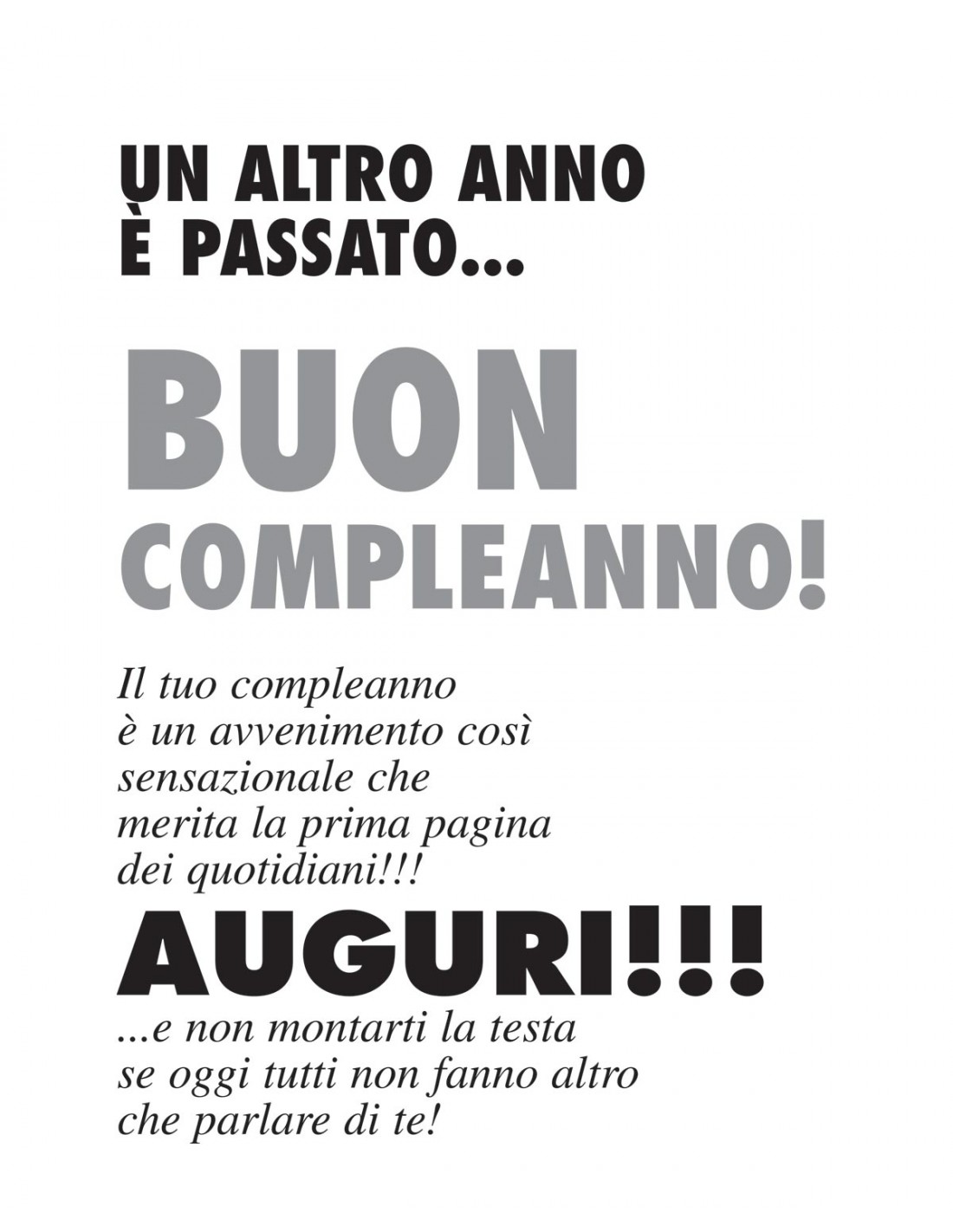 Adatto per festeggiare l'importante 70° compleanno di un tuo amico, parente o vecchio collega di lavoro. Non c'è modo migliore per annunciare al mondo intero un evento come il 70esimo compleanno:, se non con la notizia in prima pagina di un biglietto di auguri che si presenta come la copia di un quotidiano, con le dimensioni e impaginazione di un tabloid, ma che nasconde al suo interno la vera sorpresa.