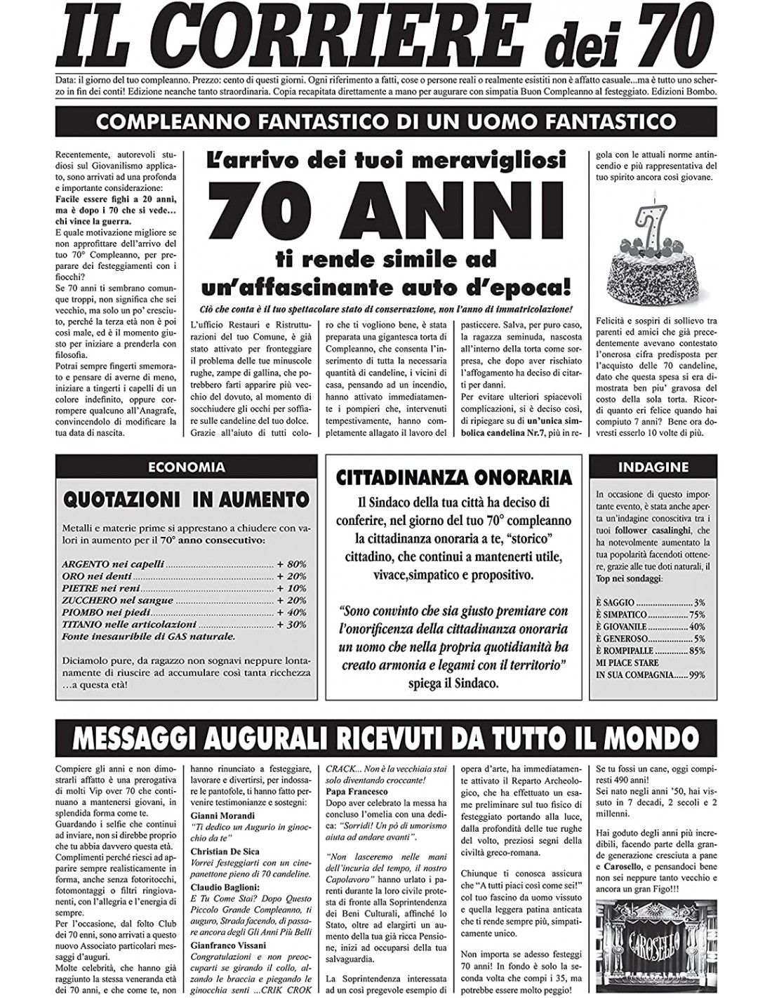 La testata si presenta in apertura con il titolo: “Il Corriere dei 70"” e articoli vari di curiose notizie su come festeggiare l’importante traguardo dei 70.