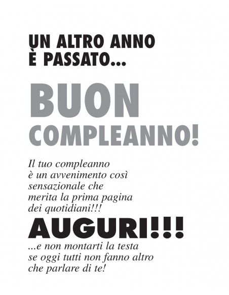 Sarà sicuramente il biglietto d’auguri più apprezzato, per l’originalità e l’umorismo dei testi dedicati e il festeggiato ti ricorderà nel tempo, con simpatia per questo tuo dono così diverso.