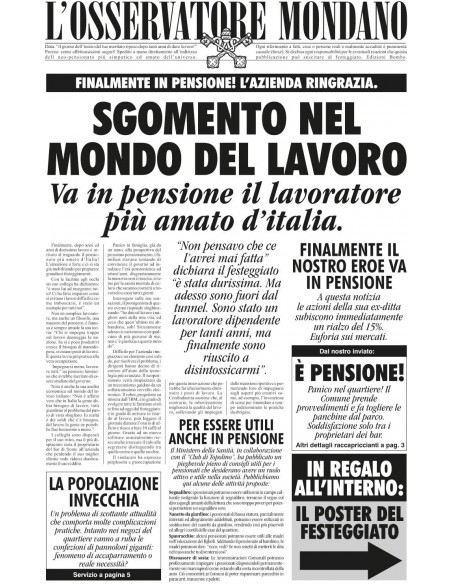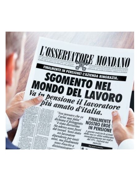 Ricalcato sui modelli dei classici Quotidiani venduti in tutte le edicole, sarà un perfetto biglietto di auguri per il tuo amico, collega o parente che dopo anni di lavoro e sacrifici, finalmente potrà godersi la tranquillità e dedicandosi ai suoi familiari e ai suoi hobby.
