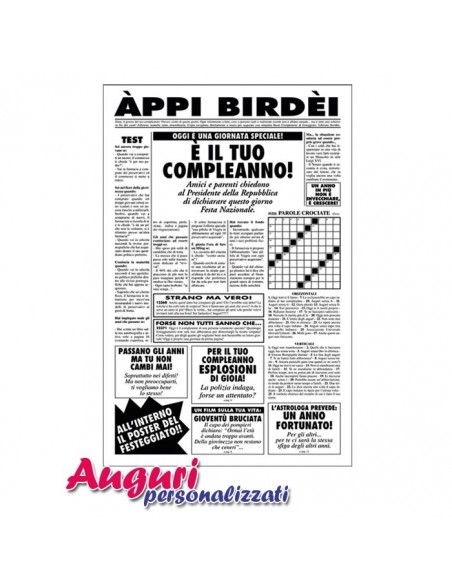 Il prodotto misura cm 32x49 ed è grande quanto un giornale. Tutti potranno firmare il biglietto e leggere le esilaranti notizie contenute all'interno. C'è anche un cruciverba che potete compilare con parole divertenti. Certamente il vostro amico non dimenticherà questo compleanno e potrà anche mettere il biglietto in cornice e ricordare quel giorno con un sorriso. La festa deve essere piacevolmente ilare senza mai offendere e questo biglietto è la soluzione perfetta.