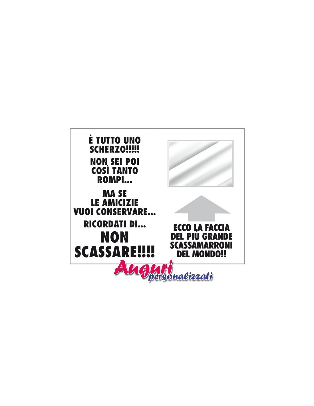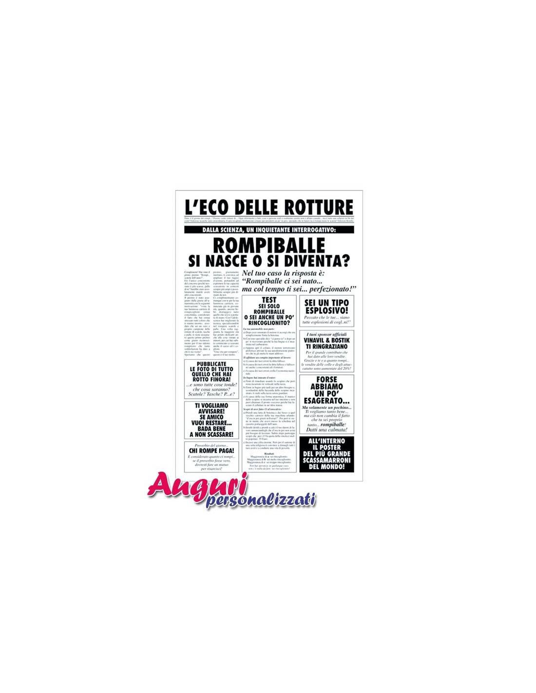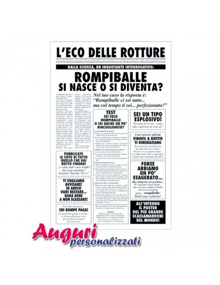 L’articolo ha le dimensioni di un vero e proprio quotidiano cartaceo (32x49 cm). La prima pagina riporta tutte notizie allegre e divertenti sul festeggiato sottolineando come l'arte di rompere si affina solamente con il tempo e che lui ne è un vero esperto. All'interno dopo tutto questo sarcasmo si ammette che è uno scherzo e che per quanto lui rompa la vostra amicizia rimanga sempre salda. Inoltre una piccola sorpresa all'interno del biglietto con l'immagine riflessa del festeggiato attraverso una carta specchio.