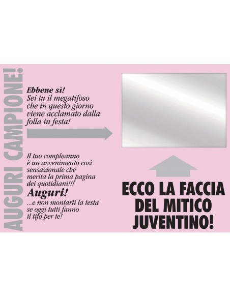 La prima pagina del biglietto sottolinea l'evento di un compleanno a centrocampo circondato da tanti servizi simpatici e divertenti riguardanti questo Juventino sfegatato, mentre all'interno una carta a specchio per far lievemente riflettere il campione dei festeggiati.