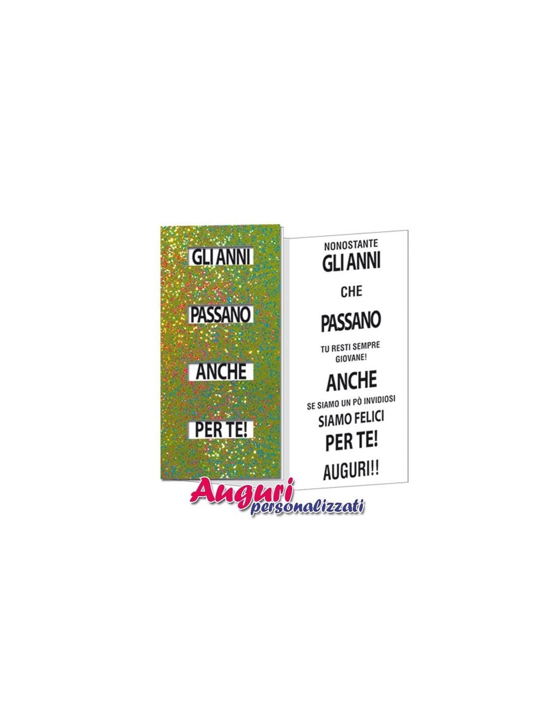 Il biglietto d’auguri per un amico che migliora con doppio senso non passa inosservato, le sue dimensioni di cm 11 x 22,5 lo vogliono in bella evidenza sul pacchetto regalo che accompagna e al quale contende la ribalta grazie al luccichio e agli auguri stampati a grandi lettere che preannunciano sfottò e battute taglienti.