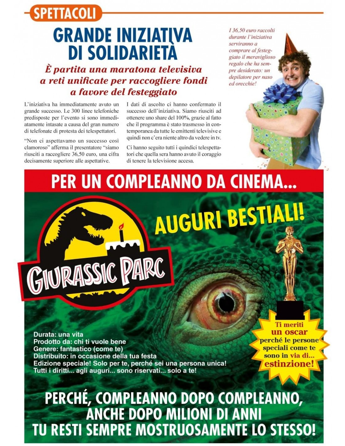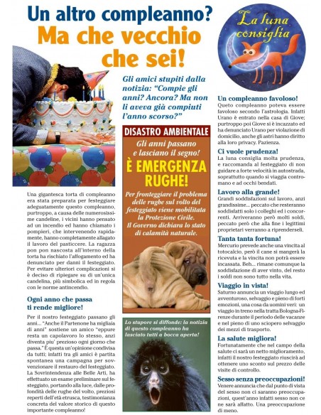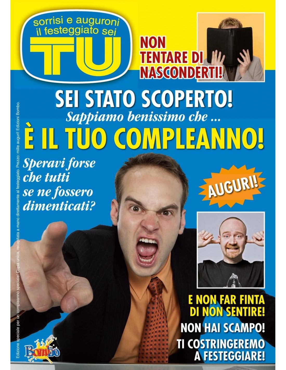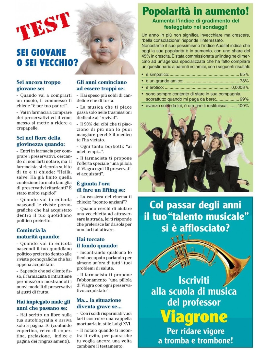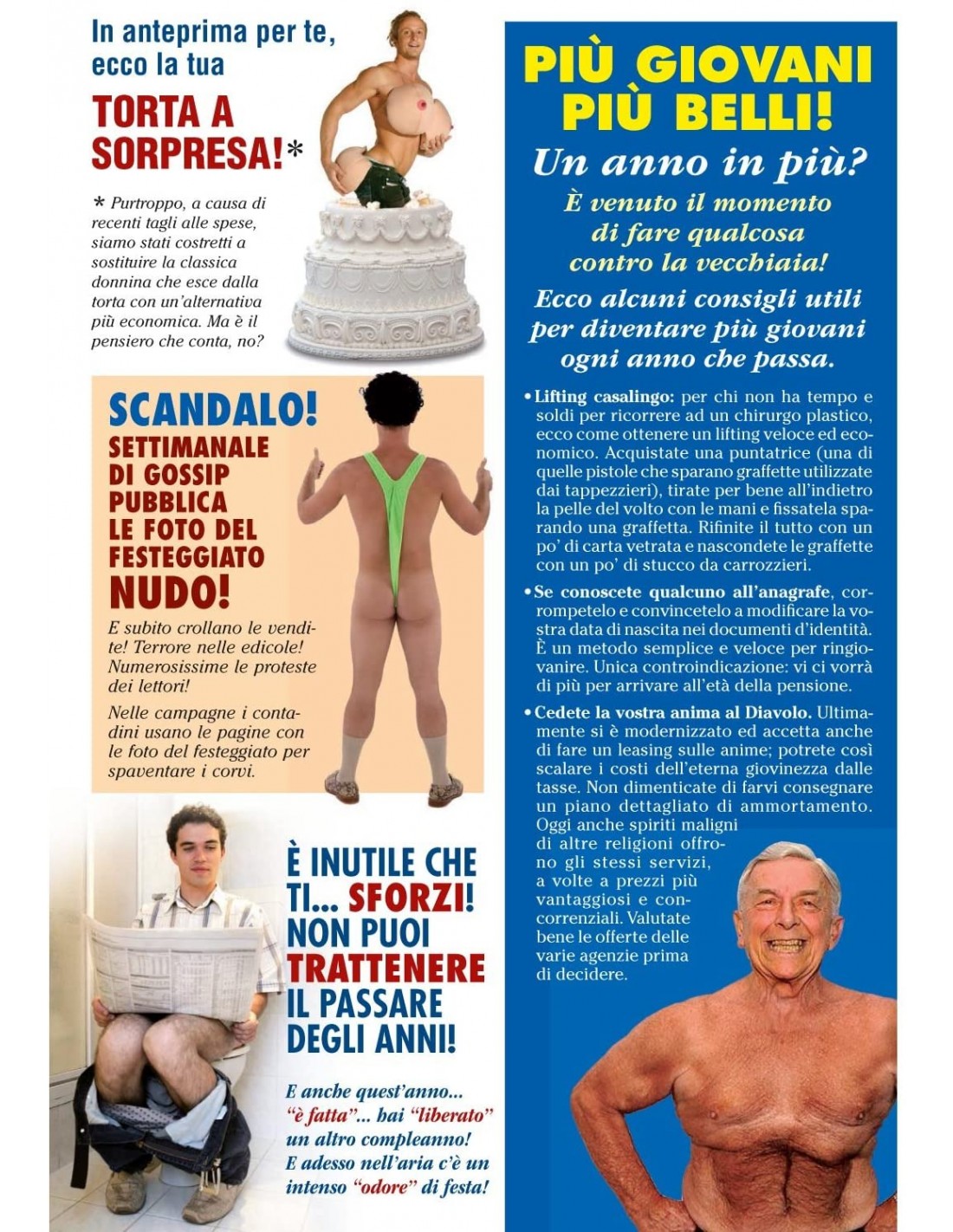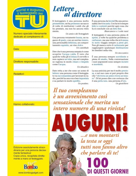 Maxi biglietto di Buon Compleanno, formato cm.21 x 30, dimensioni simili ad una vera rivista settimanale, composta da 8 pagine ricchissime di contenuti.