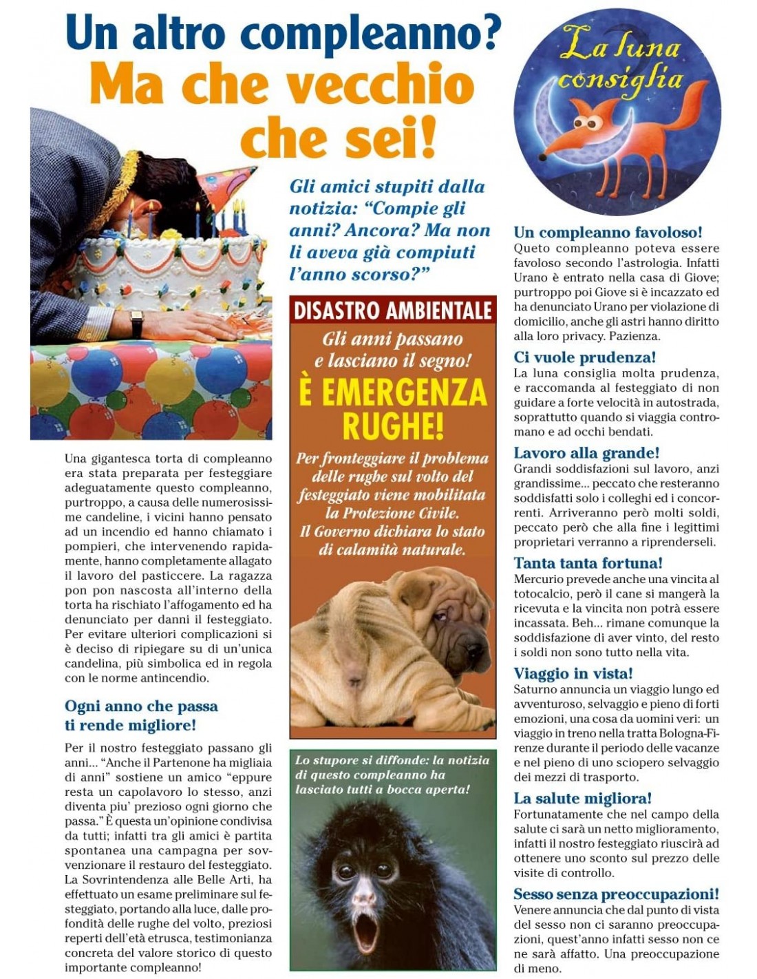 Il giornale celebra il festeggiato come una vera star, con titoli roboanti, articoli ironici e vignette esilaranti pensate su misura per strappargli un sorriso.