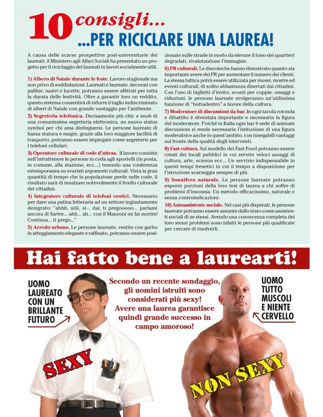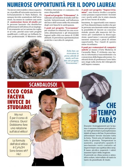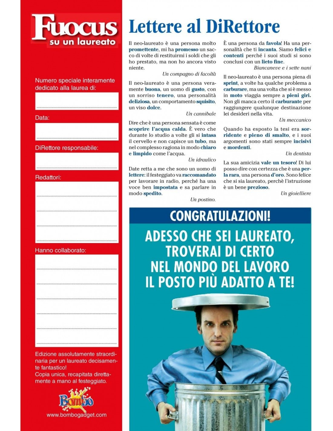 Il settimanale di auguri per il laureato è uno degli ultimi arrivati nell'ampia serie di grandi biglietti-regalo adatti a tutte le principali ricorrenze. Con i suoi 21x30 centimetri e le sue 8 pagine, è pratico e colorato come i più famosi tabloid italiani e internazionali. Al suo interno, il neo-laureato troverà notizie, servizi, opinioni di lettori, giochi e test di vario genere, tutto giustamente incentrato su di lui e sul traguardo appena raggiunto. Per un giorno lo farai sentire davvero l'idolo delle folle e dei giornali!