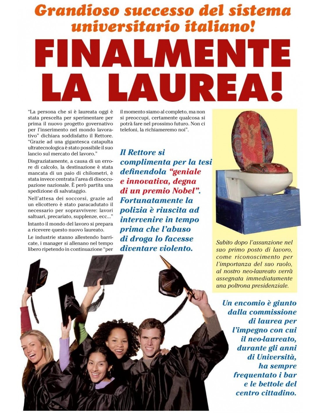Quello della laurea è un traguardo fondamentale, accompagnato da rituali ormai antichi come lanci di coriandoli, spumante a fiumi e filastrocche spesso "borderline". Con il settimanale di auguri per il laureato, il tuo amico o parente giunto a conclusione del suo percorso di studi si sentirà davvero al centro del mondo per un giorno! Vero e proprio biglietto-regalo, è ideale per allietare una festa di laurea o, perchè no, anche da consegnare direttamente il giorno del grande evento, per sorridere tutti insieme.