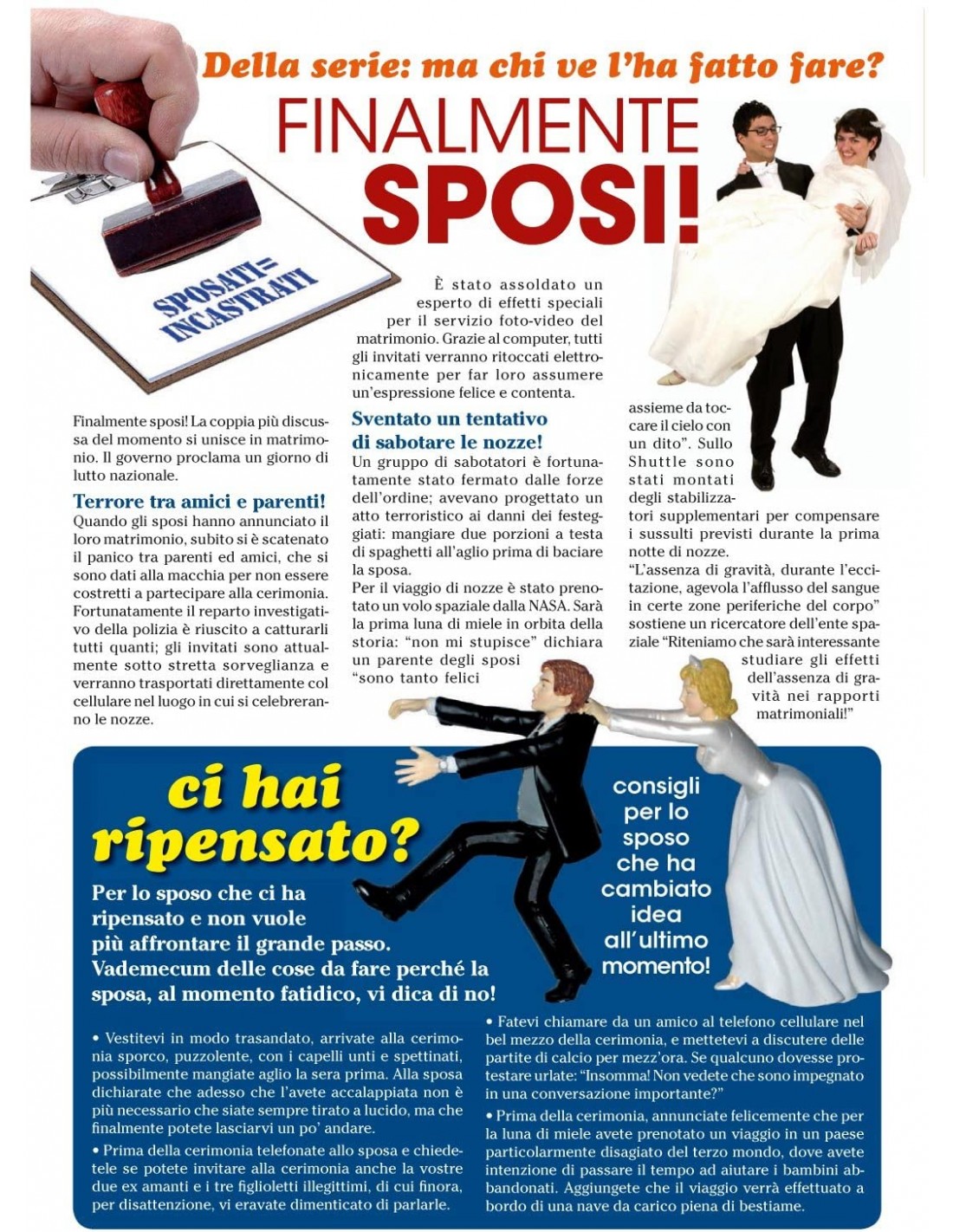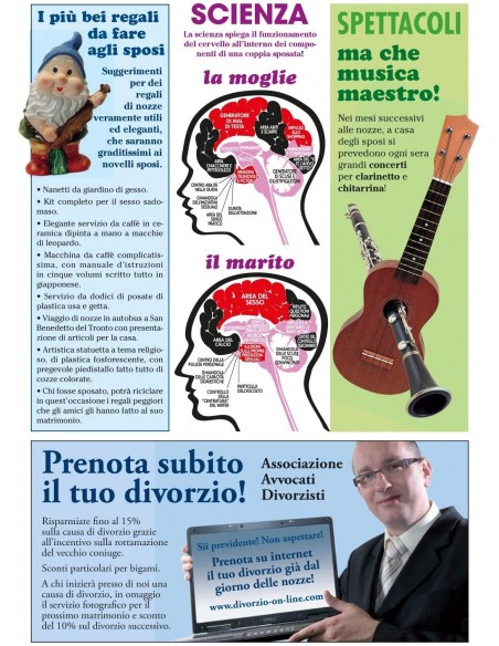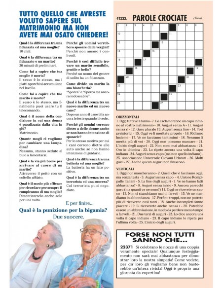 Un semplice biglietto di auguri non è sufficiente per esprimere quello che vuoi comunicare ad una coppia di amici in procinto di sposarsi? Il Settimanale di auguri per il matrimonio è la soluzione adatta che non deluderà mai. Un biglietto di auguri composto a ben 8 pagine e completo di gossip, oroscopo, lettere al direttore, test, cruciverba, pubblicità e notizie divertenti sulla coppia di futuri sposi. Un modo originale ed umoristico, diverso dagli altri soliti biglietti, per augurare il lieto evento.