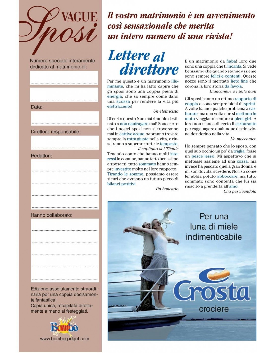 Otto pagine, anche da completare che vanno dai pettegolezzi alle notizie sulla coppia, accompagnati da pubblicità umoristiche, oroscopo e tutto quello che si può trovare in una vera rivista. Con questo gadget sarai originale, divertente e spassoso.