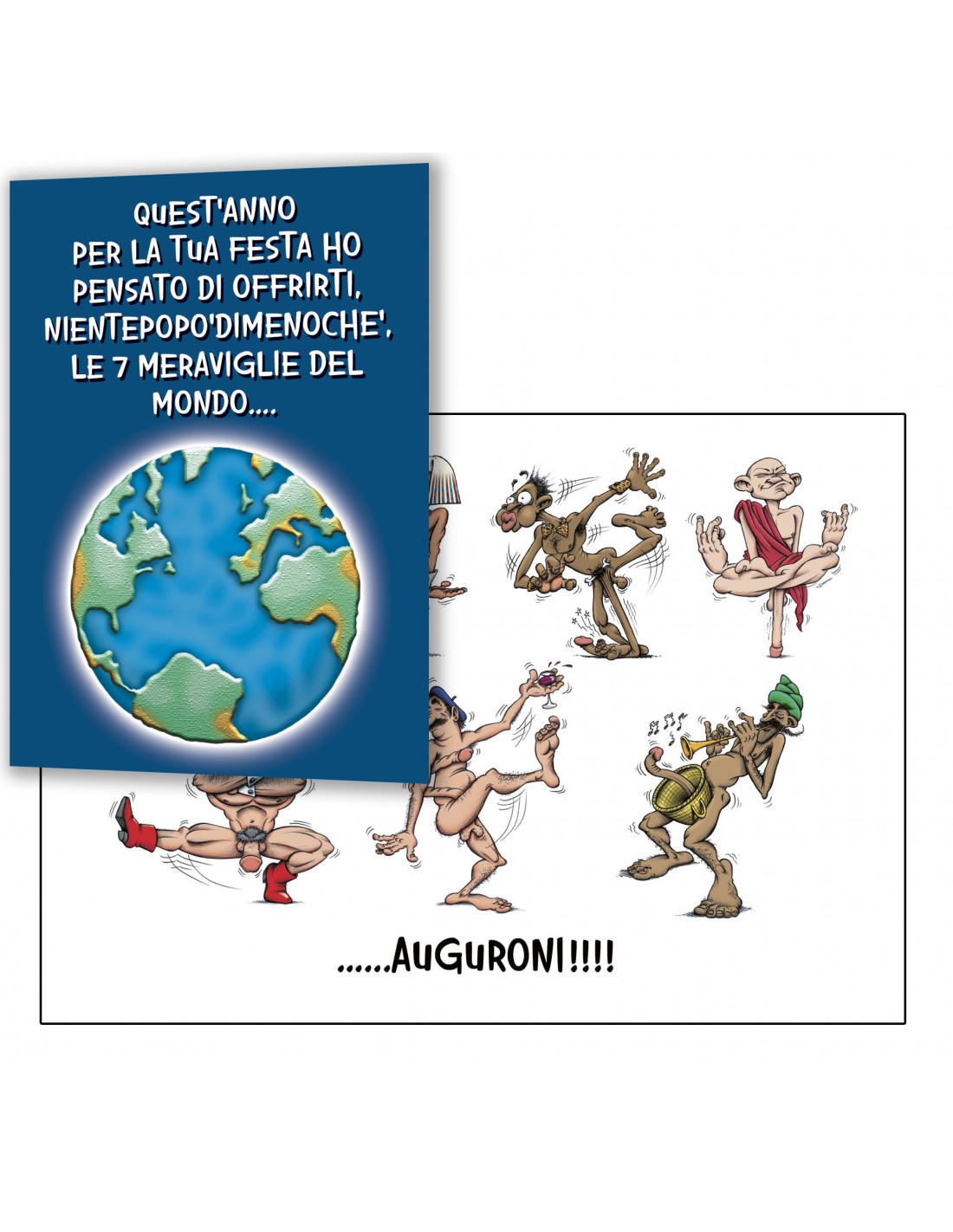 Con le sue vignette comiche e maliziose, questo biglietto è un vero e proprio giro del mondo del buonumore, ideale per auguri che lasciano il segno e scatenano le risate!