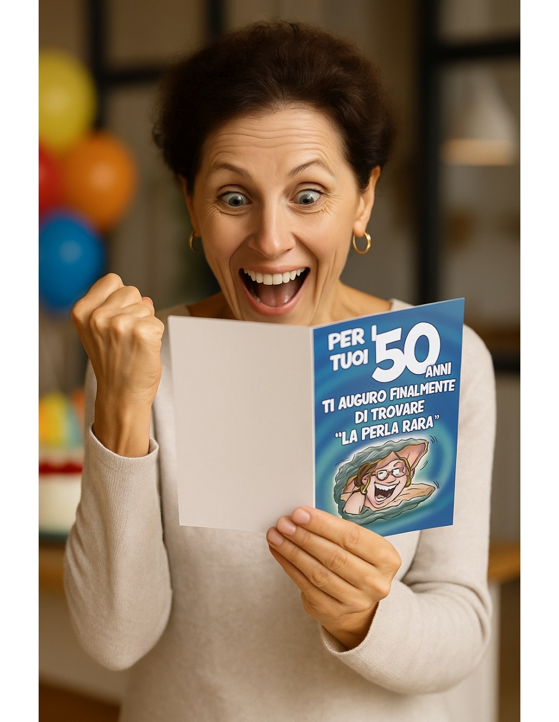Hai una tua cara amica che sta per compiere i fatidici 50 anni? Stupiscila e imbarazzala con ironia grazie a questo divertente biglietto!