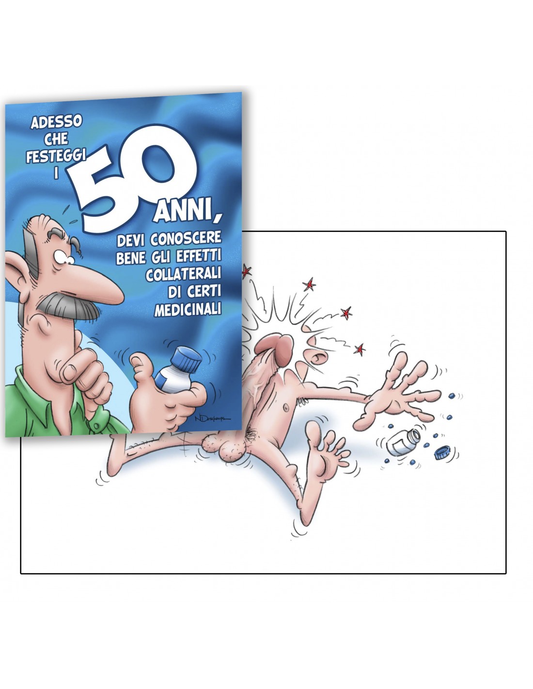 La copertina sin da subito prende in giro il classico stereotipo del cinquantenne attempato e non perfettamente in salute, ma è al suo interno che il biglietto svela tutta la sua carica umoristica invitando il festeggiato a fare attenzione agli effetti collaterali causati dall'assunzione di certe pillole particolari.