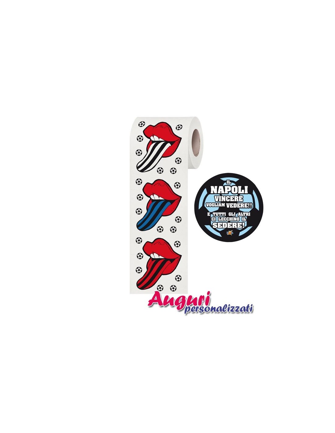 Trattasi di un rotolo lungo 30 metri composto da 2 veli. Splendidi palloni da calcio decorano in modo vivace la carta, delle vivacissime bocche con la lingua in fuori sottolineano la frase: "Il Napoli vincere vogliam vedere e tutti gli altri ci lecchino il sedere". Ogni singola bocca coloratissima in rosso fa una boccaccia, la lingua rappresenta i colori distintivi della squadra avversaria. Il tuo amico tifoso napoletano sarà contentissimo di ricevere questo esclusivo cadeau.