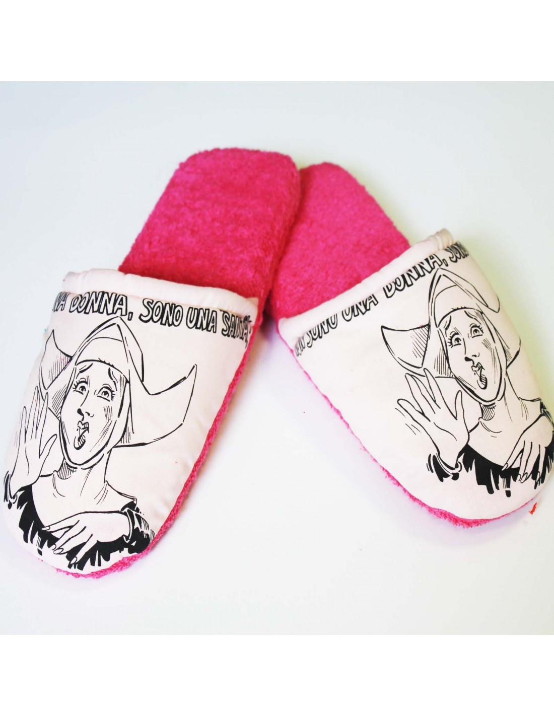 Se ti senti un po' trasgressiva, ma non troppo, ecco questo paio di ciabatte in spugna e cotone con la divertente immagine di una suora e la scritta Non sono una donna, sono una santa.