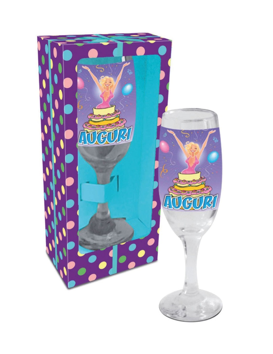 Idea regalo originale:Il flute con applicata una sottile pellicola con l’immagine di una maliziosa femmina festeggiante piena di entusiasmo che esce da una torta di auguri, sicuramente un dono poco convenzionale per il partner, una collega, i migliori amici o i vostri familiari.